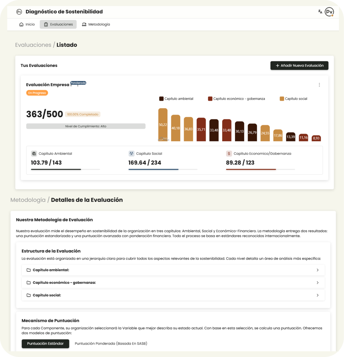 - Resultados automáticos con puntajes estandarizados y comparables que miden el nivel de madurez en sostenibilidad.